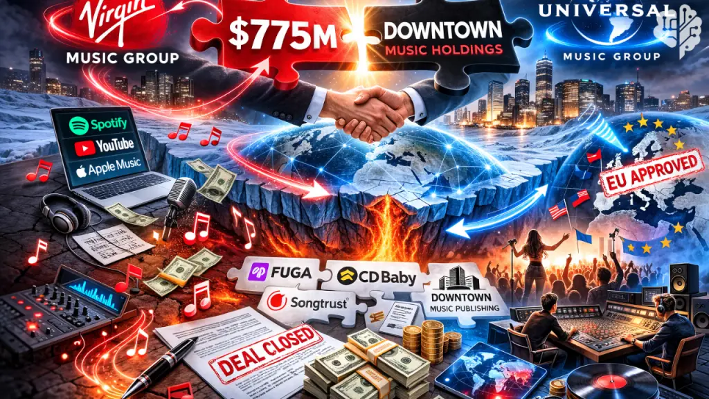 فيرجن ميوزك، ذراع التوزيع المستقل في يونيفرسال ميوزك جروب، تُتم صفقة استحواذ بقيمة 775 مليون دولار على داونتاون ميوزك بعد مراجعة تنظيمية أوروبية مطولة، وسط جدل في قطاع الموسيقى المستقلة.