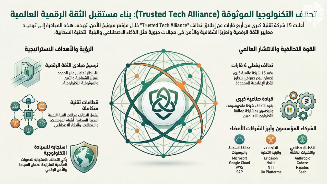 أعلنت 15 شركة تقنية كبرى من أربع قارات عن إطلاق تحالف التكنولوجيا الموثوقة Trusted Tech Alliance خلال مؤتمر ميونيخ للأمن، في مبادرة تهدف إلى ترسيخ مبادئ مشتركة للثقة الرقمية وسط تصاعد الدعوات العالمية للسيادة التكنولوجية.